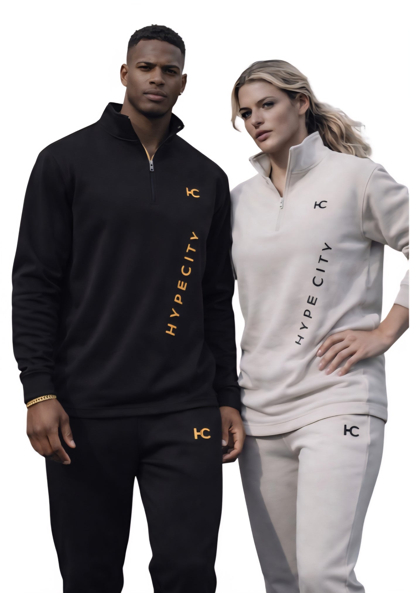 Step up your athleisure game with the HC Hype City Premium Tracksuit Set! Available in sleek black or crisp white, this matching quarter-zip pullover and jogger set features premium gold HC embroidery and vertical 'HYPE CITY' branding for a bold, sophisticated look.